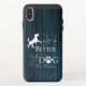 Protect your iPhone with a Life is better with a Dog iPhone XS Max Case. Case design features a deep blue rustic wooden background with the saying "Life is better with a Dog" with a paw print and canine silhouette embellishments. Additional gift items available with this design as well.