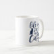 This cute quote mug is perfect for anyone who loves cats! Make the cat lover in your life happy with a gift of this funny mug featuring the saying "life is better with cats" in navy blue hand lettered typography with two cat silhouette illustrations.