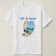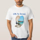 Pictured in a beach shell is a most glorious healthy beach view with lush vegetation, bleached white sand, bird life and the words life is good.