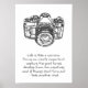 A black and white poster with a picture of a camera with an enlightening and motivating quote about life and how we should tune our perspective. "Life is like a camera. Focus on what’s important, capture the good times, develop from the negatives, and if things don’t turn out – take another shot." Author of quote is unknown. Design and quote is great for photographers or anyone who needs a pick me up in life.