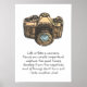 A poster with a drawing of a camera paired with an enlightening quote about how we should approach life. "Life is like a camera. Focus on what’s important, capture the good times, develop from the negatives, and if things don’t turn out – take another shot." Author of quote is unknown. The irregular lines and watercolour effects adds to the rawness of the design.