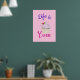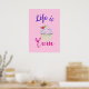 A poster which says: Life is Yum. Designed with a yummy pink cupcake with scrumptious swirls of pink frosting with a yellow cupcake holder. A raspberry with stem and leaves on top. Dreamy and delicious. Set on a pastel pink backdrop.