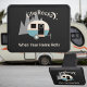 Camper theme hitch cover with text slogan "Life Rocks When Your Home Rolls", which can be edited to your own words. Printed on a black background scene of a vintage canned ham style travel trailer in blue and cream under the moon and stars. See more camper theme decor and accessories Camp_and_Cottage on Zazzle.