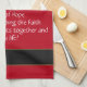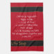Waffle weave towel is Red colored with Black & Tan stripes on each end and White text on a whimsical towel with a cute slant on life. Customize or buy as is.