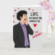 This funny greeting card shows a cartoon man laughing so hard he can’t help but cover his open mouth with one hand. He has dark, messy curls, his eyes are squeezed shut, and his face looks full of happy laughter. He’s wearing a black suit jacket with a lavender collared shirt, giving him a dressed-up look that still feels friendly. The background is light gray with small red hearts scattered around, setting a romantic, affectionate mood ❤️. On the right side, the message “LIFE WITHOUT YOU WOULD BE” appears in black block-style letters, followed by a single red heart like a pause in the sentence. Under that, “THE WOOOOORST” is written in red, hand-drawn letters that are slanted, making the joke feel extra dramatic 💌