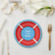 Red life preserver design on blue curley wave background to personalize for fun custom nautical themed party products.