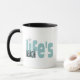 Life's A Beach Coffee Mug. Black and Beach Blue type with starfish. Design from Jenn's Emporium.