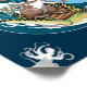 Graphic design representing a rabbit surfing an ocean wave on the back of a turtle.