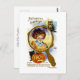 Vintage Halloween greeting card illustration with text "Light all the pumpkins and let their weird gleam, Call Witches and Goblins to keep Halloween."