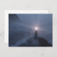 A lighthouse with a cross as the light shines out over the rocks and breakers of a mist-covered shore, showing incoming boats the way to safety.