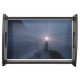 A lighthouse with a cross as the light shines out over the rocks and breakers of a mist-covered shore, showing incoming boats the way to safety.