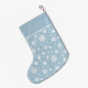 Elegant, personalized Christmas stocking featuring your name at the top in a white script font. The stocking features a pattern of white snowflakes that flow down the design with a light blue background. The design repeats on the back.