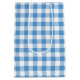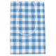 Skip the hassle of wrapping and deliver your present in a classic gift bag featuring a light blue and white gingham plaid pattern made of light blue, white, and pale blue squares.