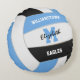 This sporty volleyball themed throw pillow features a realistic looking light blue, black and white volleyball upon which you can customize the player's name, monogram or varsity letter, team and mascot name on the front and jersey number on the back - by katz_d_zynes