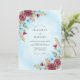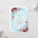 This design features a soft light blue watercolor wash paired with deep burgundy floral accents. Hand-painted burgundy dahlias and roses are complemented by icy blue anemones and delicate earthy foliage. The contrast between warm jewel tones and a cool background creates a romantic atmosphere for a winter or late autumn event.
