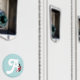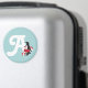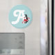 A penguin is standing with a red and white inner tube and beach ball with a light blue background. This pretty animal cartoon with personalized monogram makes a cute and unique magnet for kids.