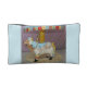 This cosmetic bag features a light blue carousel horse golden retriever.