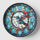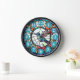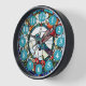 "hummingbird bird clock", "blue humming bird", "red flowers floral wall clock", "stained glass style art", "stain glass flowery nature", "beautiful animals in flight", "pretty flying spread wings",