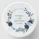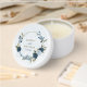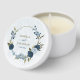 Beautiful romantic wedding mini candle tin favor featuring navy blue and light dusty blue flowers and some pretty leaves .