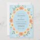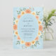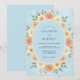 This design features a soft light blue backdrop adorned with a lush arrangement of watercolor peach roses and sunny yellow wildflowers. Verdant green foliage and delicate sprigs weave through the floral display to create a bright and airy atmosphere. The color palette of pastel blue, warm orange, and gold evokes a cheerful spring mood.