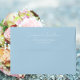 Light blue color mailing envelope for your wedding invitations and features your name and address printed on back flap in a modern script style. Personalize your envelope by editing and replacing name and address with your own. Edit further to change font style or color. Select your envelope size that fits your invitation.