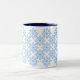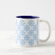 Wintry mug with a dark blue interior and a pleasing pattern of light blue snowflakes on a white background.