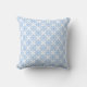 Wintry throw pillow with a pleasing pattern of light blue snowflakes on a white background.