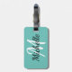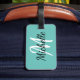 Bag tag with a light teal blue background and white custom monogram first initial and first name