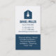 A business card with a hanging light bulb within a house icon logo. Color palette of dark blue and white. Perfect for electricians and those providing electrical wiring and lighting fixtures installation services. Personalize with your business information in the easy to read text templates provided.
