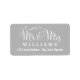 Soft light gray creates an elegant backdrop for whimsical white calligraphy spelling "Mr. & Mrs." with graceful swooping flourishes on this wedding return address label. The family name and address appear centered below in clean caps for a romantic, modern finishing touch. All text is fully customizable.