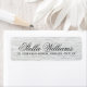 Elegant return address labels with your name in an elegant calligraphy script font and the address below on a light gray wood grain background.