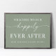 Simple Light Green Welcome To Our Happily Ever After Sign - in beautiful handwriting script and your personalized text. A stylish yet simple design in any background color you choose. Just click the edit using design tool link, shown under the text personalization area on the right, and choose your custom color background. This sign poster template makes it fast and easy to create stunning additions to your wedding decor. Signs can be enlarged, there are many sizes to choose from, as well as options for custom framing and matting.