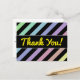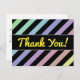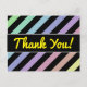 This postcard design features a pattern of stripes colored various light pastel colors, with black stripes in between them. It also features the message "Thank You!" on the front in yellow script-like text, along with a personalized message of gratitude on the back.