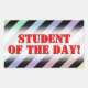 This design features a pattern of stripes colored various light pastel colors, with black stripes in between them. It also features the message "STUDENT OF THE DAY!".