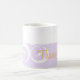 Customizable white mug with a lilac decorative band (Thank You is not customizable). You can easily add and change text (font, size, color and position) by clicking the customize button. Other models are available.