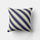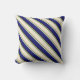 This throw pillow design features a pattern of stripes having colors like light salmon, sea green, beige, midnight blue, and black.