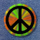 Bright orange, lime green and yellow fractal light show with a black peace symbol.