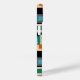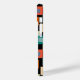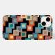 This phone case has a geometric design of squares inside squares in lighter shades of blue, teal, orange, tan, off-white, mango, and gray on a field of black.