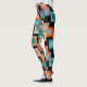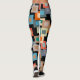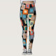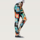 These leggings have a geometric design of squares inside squares in lighter shades of blue, teal, orange, tan, off-white, mango, and gray on a field of black.