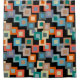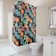This shower curtain has a geometric design of squares inside squares in lighter shades of blue, teal, orange, tan, off-white, mango, and gray on a field of black.