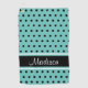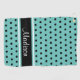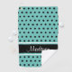This design has a light teal background with black polka dots and black, light teal and white stripes. The name is in a script font and can be customized using the template field.