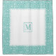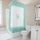 Light teal blue and white damask pattern and white square with monogram shower curtain. It showcases a light teal blue and white damask pattern and a white square in the center with your monogram and scalloped borders. You can personalize it with your family name and monogram.