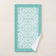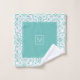 Light teal blue and white damask pattern and scalloped borders Bath Towel Set. The bath towel features an elegant light teal blue and white damask pattern and bands on the short sides with scalloped edges. There is also a frame with your family name. The hand towel showcases a scalloped border around it while the wash cloth is in blue in the center with a damask border and your monogram. You can personalize it with your family name and monogram.