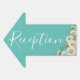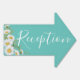 Pretty outdoor wedding directional sign features watercolor white daisies corner on light teal background with white customizable text blocks in modern fonts