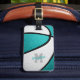 This sporty basketball themed luggage tag features an abstractly oversized basketball with alternating recolored light teal and white panels - personalize with the athlete's name and monogram on the front, address and phone number on the back - by katz_d_zynes