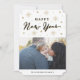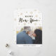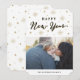 This fun New Year design features a black, white and gold color scheme with fireworks and star graphics lighting up the sky! A hand lettered calligraphy font flows across the design reading "Happy New Year" with space to include your photograph.