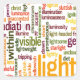 This artwork centers on the word "light" rendered in large, bold letters. Surrounding this focal point are numerous related words, arranged in varying sizes and orientations, filling the frame and creating a dense, visually interesting composition. The arrangement of words forms a lively word cloud, emphasizing the central theme of light.