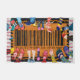 A painted doormat with a barcode pattern, with various feet and shoes standing on it.