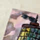 traditional watercolor artwork of a lighthouse standing on a green island with a colorful sunset and distant mountains in the background on a beack towel