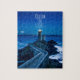 Lighthouse at twilight flashing its beacon into the sea. The words "Follow the Light" are written in white text.
